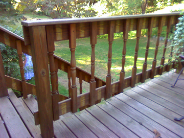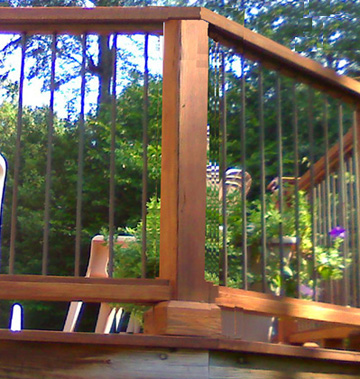 My friends have a nice raised deck on the rear of their house but were never happy with the railings and balusters that the contractor installed. The top rail was a 5/4 x 6 pressure-treated board which sagged in the middle of each span. The railings were the same material, turned on edge and nailed to the posts with pressure-treated faux turned balusters screwed on the faces instead of mounted between a bottom and top rail as they are meant to be. The owner had attempted to open up the view by removing every other baluster, which put the deck out of compliance with the code. She asked me to create a railing system that would be less bulky and more open.