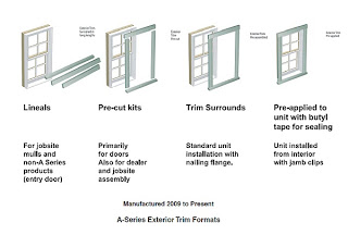Andersen offers exterior trim kits for their 400 and Architectural series windows. The pieces are constructed of fibrex and are designed to snap into the special nailing flanges that are used to secure windows in place. There is a choice of brickmold, 3 1/2″ or 4 1/2″ casings as well as a sill nose. Application diagram