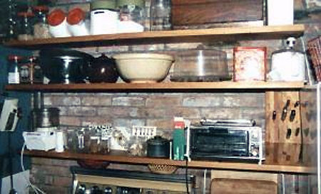 Using a hammer and another board so that I don’t dent the shelves, I pound the shelf board on to the wall pins. The pressure of the pins on the sides of the holes holds the shelf firmly to the wall.