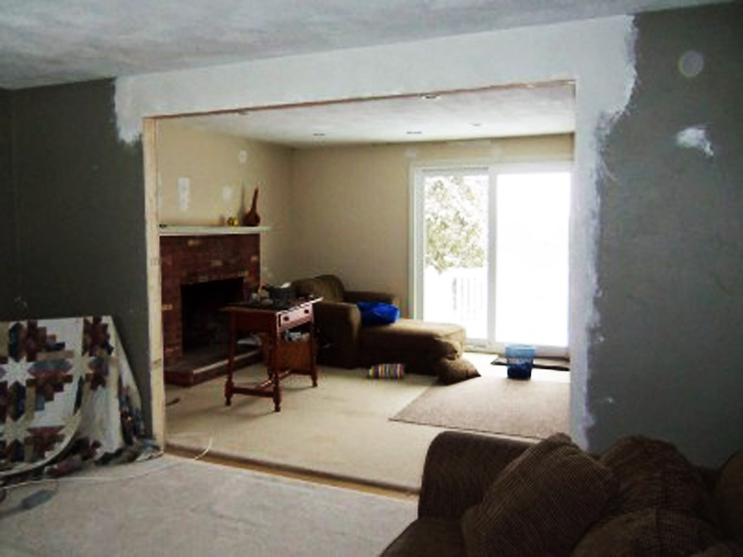 This week the homeowner and I opened up the wall between the living room and the playroom, bringing light into that whole side of the house. We first considered removing the entire wall, but the 2009 International Residential Building Code does not allow beams lower than 7’0″ and this house has a 7′ 6″ ceiling,