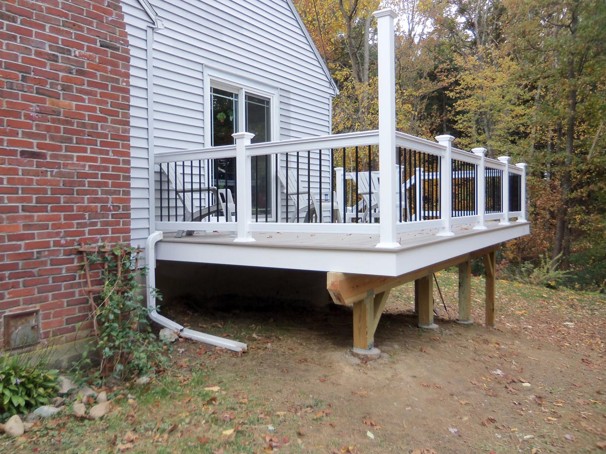 In October, 2016 I built this deck for a couple in Ipswich. They had a sliding door installed the previous year in the family room, but it took a while for them to go through the permitting process. With the weather beginning to turn, the owner and I dug the Sonotube holes on a rainy Sunday morning. Tim Gillette of Olde new England Properties assisted me with the pressure-treated framing and installing the decking.
