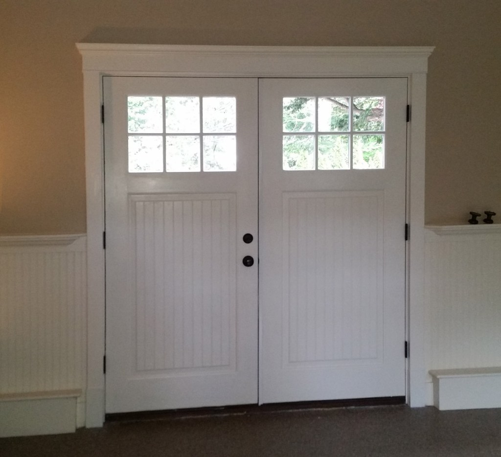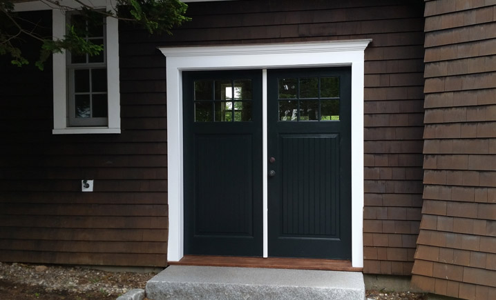 Late last fall I helped my client order two sets of prehung Simpson 7228 Bungalow French doors through John Garth at Tedford Lumber in Ipswich. The house was built about a dozen years ago with very similar doors that were made of untreated pine and had serious rot. We stored the new doors for the winter, and then painted and installed them in the spring. The doors are very solid and quite heavy, so it took two men to do each installation.