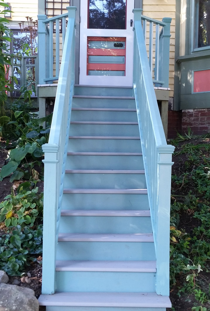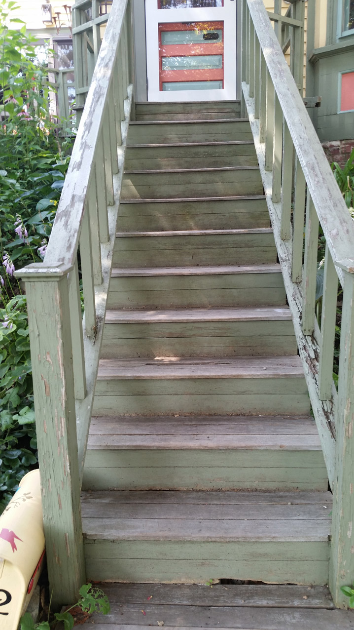The front landing stairs of this Victorian house were terribly rotted and waiting for someone to get hurt. The rails were only 30″ high, and the balusters were spaced about 12″ apart.