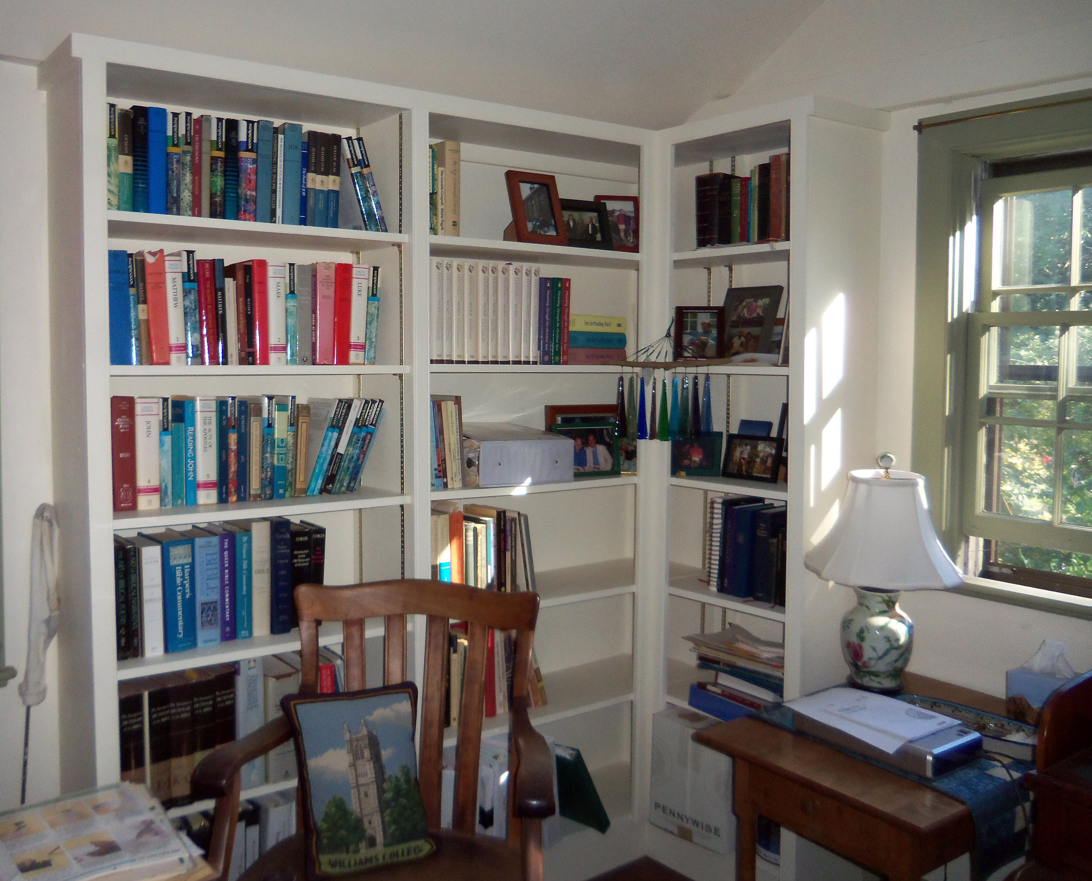 I made new bookshelves for both sides of the rear room in my shop and installed them on site. The house has settled over the years such that the set on the left is two inches shorter than the set on the right (not shown).