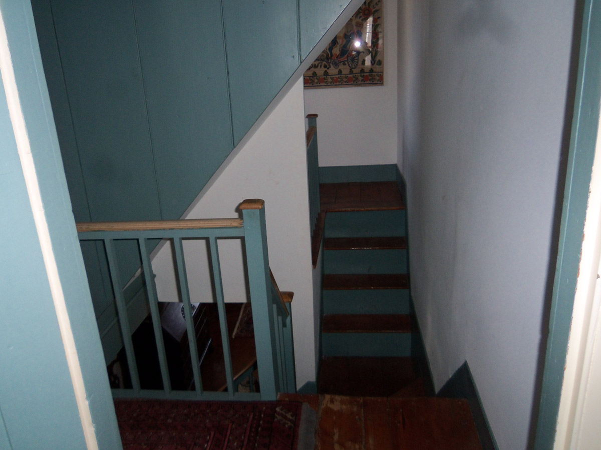 It was impossible to bring the assembled bookcases up the narrow front stairs. A previous owner installed a large trap door in the second-floor room, which is how we brought in the new bookshelves.