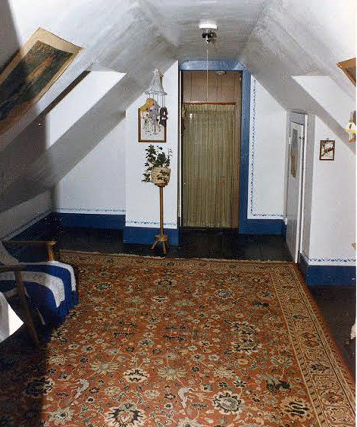 The upstairs room in the rear ell was a challenging project, with its intersection of old roof lines, gables, dormers, valleys, seriously out-of-plumb walls, and a rolling floor. There was no such thing as square or level and I had to measure the angle of every board I put up. The end result was fascinating! The intersection of the roof line and dormer walls creates the unusual ceiling shapes in the photo. The front door of the room leads to the original part of the house and the rear door exits to the back stairway.