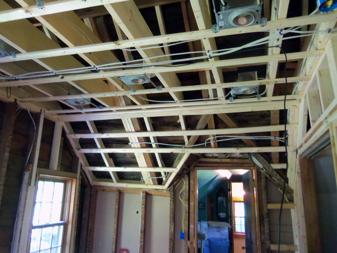 The above photo shows the room after we framed the ceiling to 8′ (in the middle). You can see the old ceiling line above the closet doorway. In the background is the room shown at the beginning of this post.
