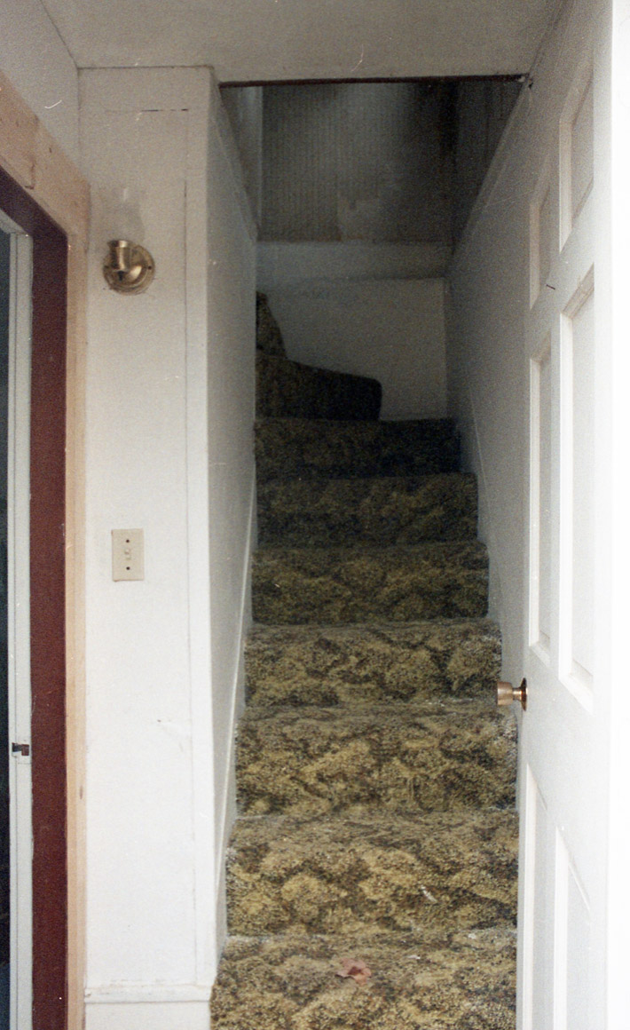 There was no room to expand or widen the stairway, but making each step consistent and adding a 7/8″ nose definitely made the stairs feel safer. You can see in the picture that I’ve added a slight molding detail that defines the top of the stringers. Drywall had been installed over the old plaster a few years ago, in line with the top of the stringers. Here’s what they looked like in 1985.